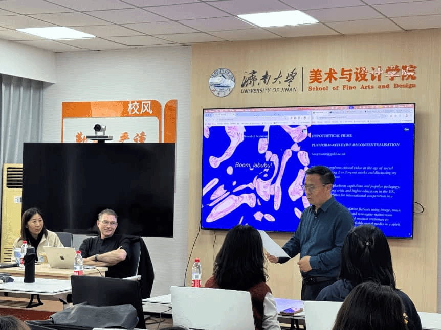 在主讲环节,司墨教授以社交媒体时代的影像创作为核心议题进行分享,深入阐述其创作方法与核心理念,结合《你让我感觉如此(1917)》《轰!拉布布!》等代表作展开分享。他深入剖析作品背后的创作逻辑,围绕平台资本化、英国生活成本危机、高等教育现状等现实议题,阐释如何以零基预算的视觉表达,融合影像、音乐与文本构建思辨性虚构叙事,进而重构主流媒体语境、重新想象媒介形态。司墨教授运用影像、音乐与文本构建思辨性虚构叙事,以重构主流媒体的语境并重新想象其形态的方式为学校师生带来了崭新思考。