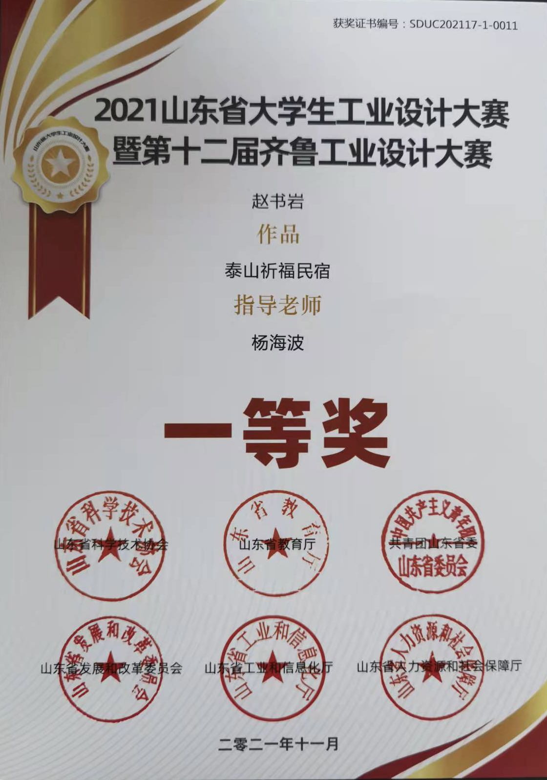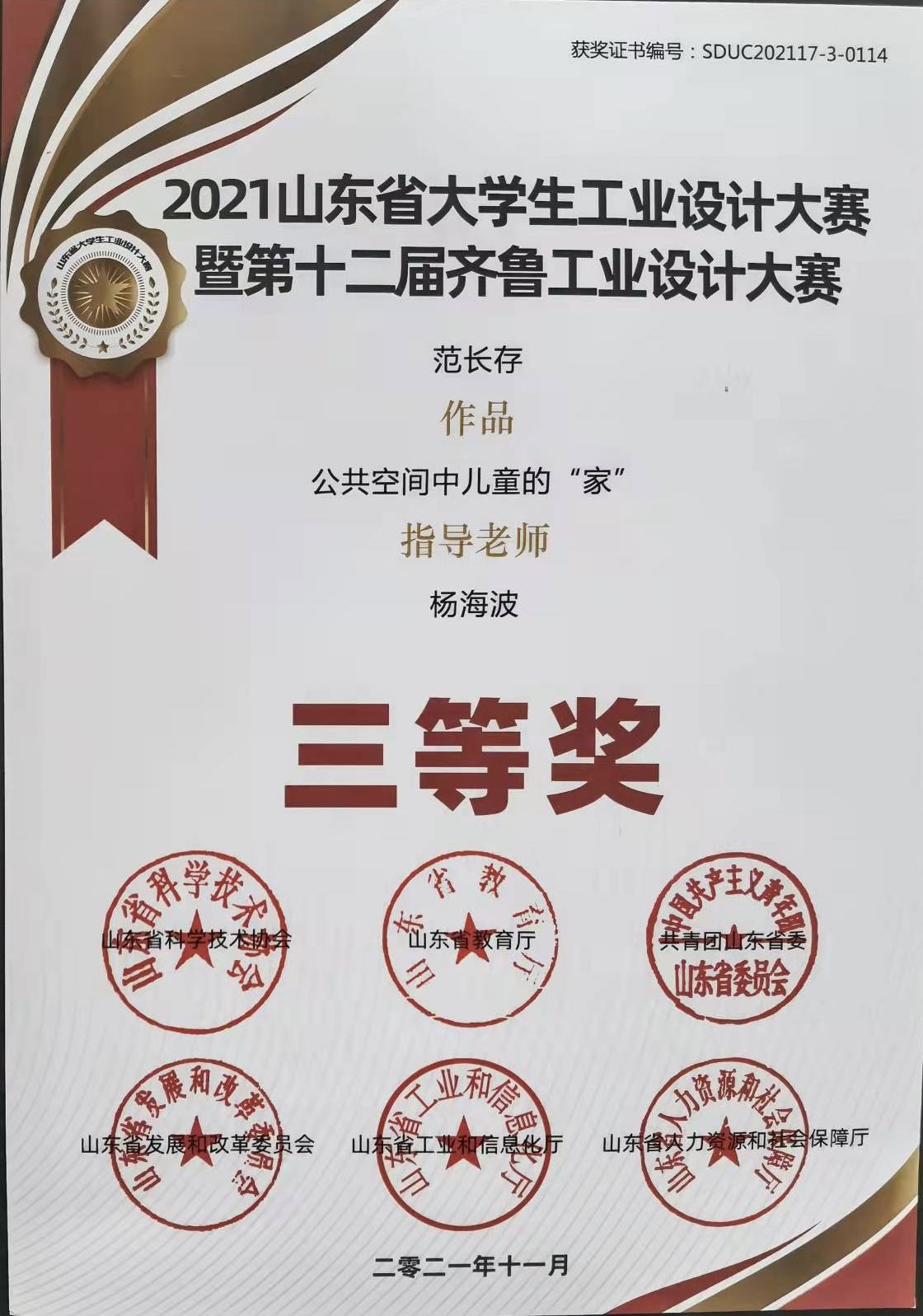 师生在本次比赛中硕果累累,成绩斐然。其中,2021级艺术设计专业研究生赵书岩同学作品《泰山祈福民宿》获一等奖;2021级艺术设计专业研究生杨博同学作品《羌姆面具》获一等奖;2021级设计学专业研究生范长存同学作品《公共空间中儿童的“家”》获三等奖;杨海波获优秀指导教师奖。